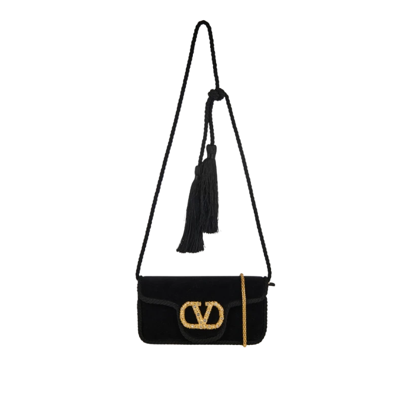 VALENTINO - Sac porté épaule bandoulière Loco velours lisse noir Vlogo doré cristaux