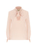 Chemisier coupe droite en soie légère. Col lavallière à franges, décolleté en V et poignets à nouer.